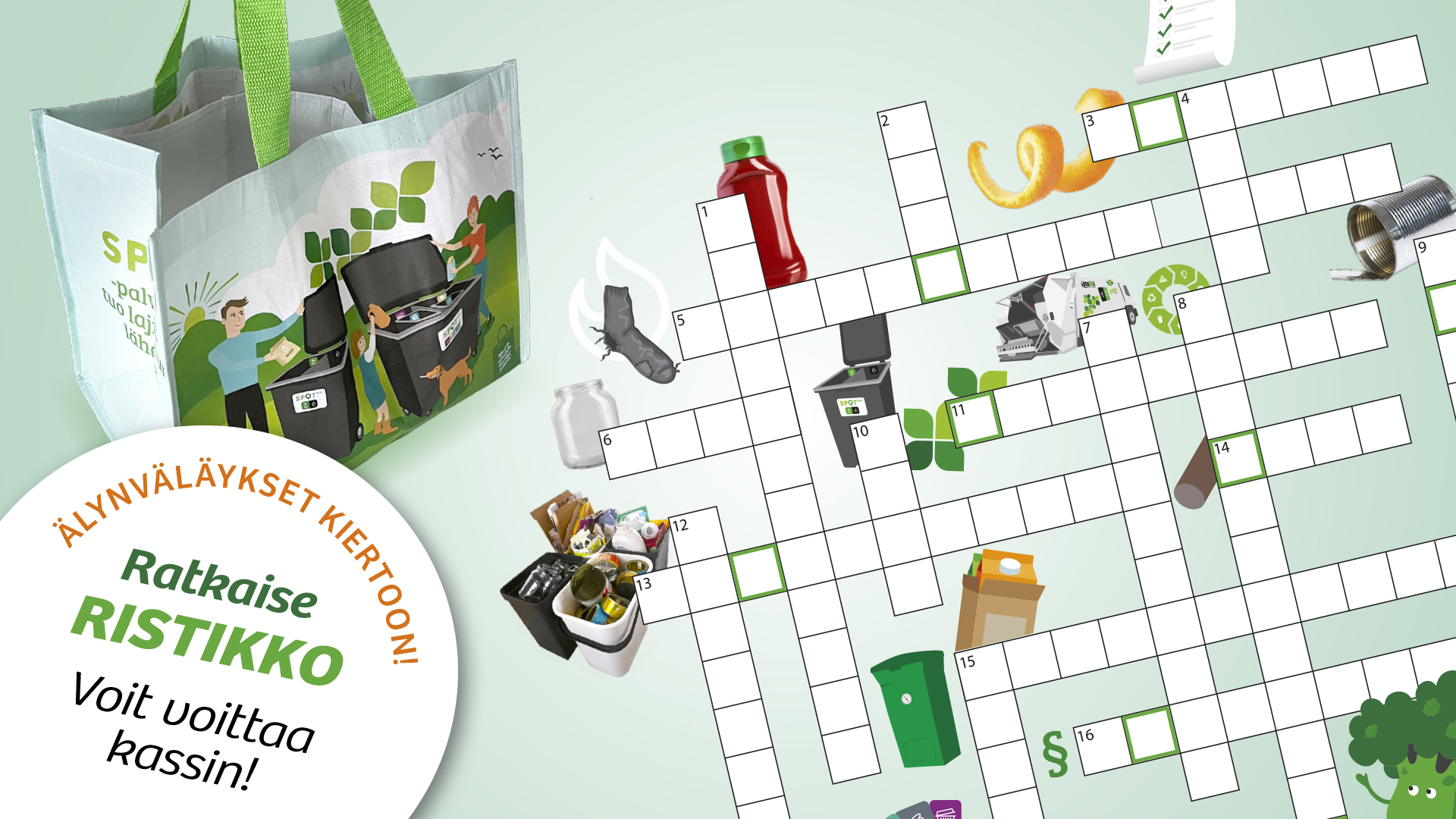 Ristikon sanat liittyvät lajitteluun, kierrätykseen ja arjen kiertotalouteen.