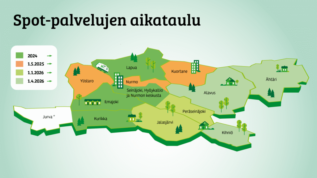 Spot Plus -palvelu on jo käynnissä Lapualla, Ilmajoella, kanta-Kurikassa, Kuortaneella ja Seinäjoella lukuun ottamatta Peräseinäjoen aluetta. Palvelu kattaa koko Etapin toimialueen vaiheittain vuoden 2026 kesään mennessä, pois lukien Jurvan alueen, jossa kaksilokerokeräystä ei voida toteuttaa erilaisen jätteenkuljetusjärjestelmän takia.