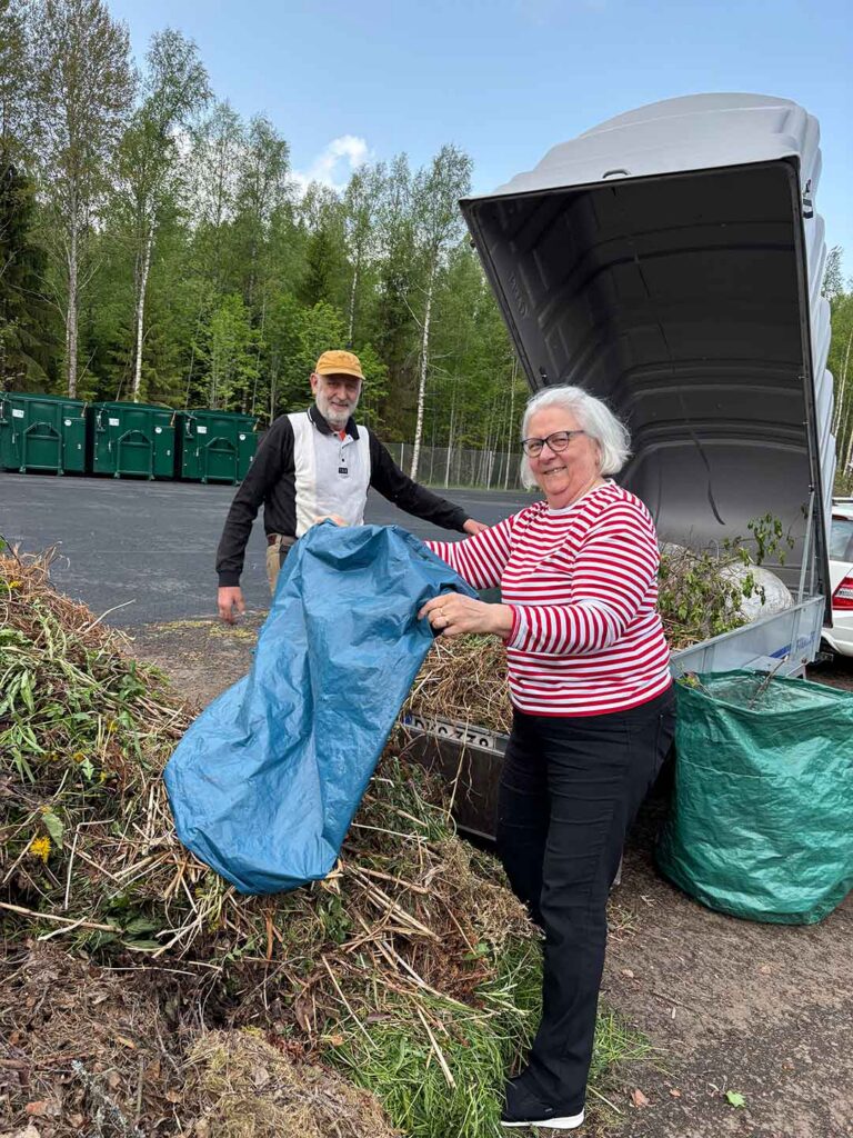 Myös Anna-Maija ja Henry Väliaho-Lång purkivat puutarhajätekuormaa Tarhassa. Pariskunta on käyttänyt ahkerasti vanhaa jäteasemaa ja tarkoitus on jatkaa samaan malliin uudella RE-pisteellä ja ladata RE-appi itsepalveluasiointia varten.